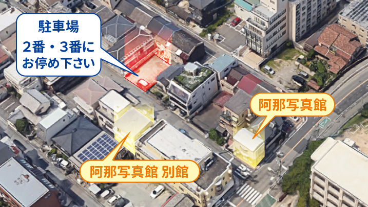- 当店の駐車場は、阿那写真館本館の西側にございます。